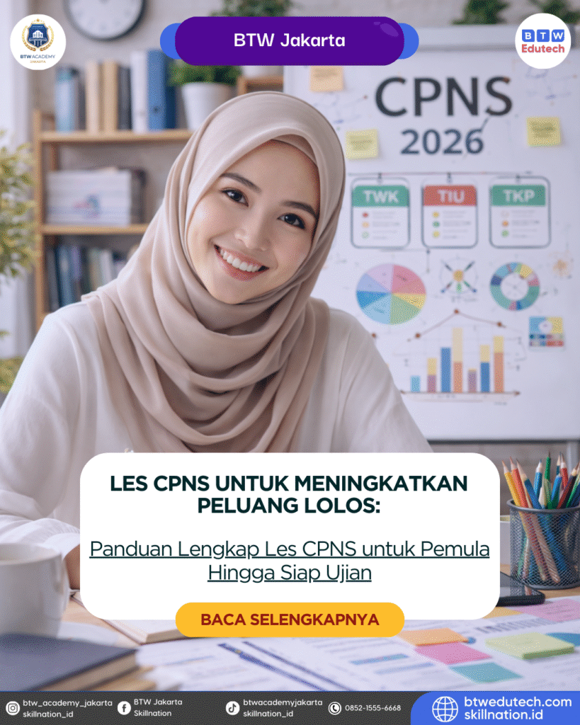Cara Konsisten Latihan Seleksi Calon Pegawai Negeri Sipil (CPNS) atau ASN (Aparatur Sipil Negara) selalu menjadi salah satu proses rekrutmen yang paling kompetitif di Indonesia. Banyak peserta yang sebenarnya memiliki kemampuan, namun gagal karena kurang konsisten dalam belajar dan latihan. Padahal, kunci utama untuk lolos seleksi CPNS bukan hanya kecerdasan, tetapi juga konsistensi dalam latihan dan strategi belajar yang tepat. Artikel ini akan membahas cara konsisten latihan CPNS agar peluang lolos seleksi ASN semakin besar. Mengapa Konsistensi Sangat Penting dalam Persiapan CPNS? Dalam menghadapi seleksi CPNS, materi yang harus dipelajari cukup banyak, mulai dari Tes Wawasan Kebangsaan (TWK), Tes Intelegensia Umum (TIU), hingga Tes Karakteristik Pribadi (TKP). Tanpa konsistensi, peserta akan: Sebaliknya, dengan latihan yang konsisten, kemampuan akan meningkat secara bertahap dan lebih siap menghadapi ujian. 1. Tentukan Target Belajar yang Jelas Langkah pertama agar konsisten adalah memiliki target belajar yang jelas dan terukur. Contoh target: Target yang jelas akan membantu Anda tetap fokus dan termotivasi. 2. Buat Jadwal Belajar yang Realistis Konsistensi tidak akan tercapai tanpa jadwal yang teratur. Buatlah jadwal belajar yang sesuai dengan aktivitas harian Anda. Contoh jadwal: Pastikan jadwal tersebut realistis dan bisa dijalankan secara rutin. 3. Mulai dari Durasi Kecil, Tingkatkan Bertahap Banyak orang gagal konsisten karena langsung belajar dalam waktu lama. Sebaiknya mulai dari durasi kecil, misalnya: Dengan cara ini, belajar akan terasa lebih ringan dan mudah dijalankan secara konsisten. 4. Gunakan Metode Belajar yang Variatif Agar tidak bosan, gunakan berbagai metode belajar, seperti: Variasi metode belajar akan membuat proses belajar lebih menarik dan tidak monoton. 5. Fokus pada Latihan Soal Secara Rutin Latihan soal merupakan kunci utama dalam persiapan CPNS. Semakin sering berlatih, semakin terbiasa dengan pola soal. Manfaat latihan soal: Usahakan untuk mengerjakan soal setiap hari, meskipun dalam jumlah kecil. 6. Evaluasi Hasil Belajar Secara Berkala Evaluasi sangat penting untuk mengetahui perkembangan kemampuan Anda. Lakukan evaluasi dengan cara: Dengan evaluasi, proses belajar menjadi lebih terarah. 7. Bangun Kebiasaan dan Disiplin Konsistensi tidak hanya tentang motivasi, tetapi juga tentang kebiasaan dan disiplin. Beberapa tips membangun kebiasaan belajar: Semakin sering dilakukan, belajar akan menjadi kebiasaan yang otomatis. 8. Jaga Motivasi dan Tujuan Dalam proses belajar, rasa bosan dan lelah pasti akan muncul. Oleh karena itu, penting untuk selalu mengingat tujuan Anda. Tips menjaga motivasi: Motivasi yang kuat akan membantu Anda tetap konsisten hingga hari ujian. Tips Tambahan agar Lolos Seleksi ASN Selain konsistensi, ada beberapa tips tambahan yang dapat membantu Anda: Persiapan yang matang akan meningkatkan peluang untuk mendapatkan nilai tinggi. Bava Juga: https://set.or.id/cara-meningkatkan-peluang-lolos-sekolah-kedinasan-dengan-mengikuti-les-kedinasan/ 📌 Segera bergabung dengan mengubungi kami dan wujudkan transformasi karier Anda. 📩 Email: cs@skillnation.id📞 Telepon: 0852-1555-6668📸 Instagram: @btw_academy_jakarta📘 Facebook: BTW Academy Jakarta🌐 Website: skillnation.id📍 The Wayang Office Plaza Lt.3, Kav. A, Jl. Kedondong Raya No.5A, Rawamangun, Jakarta Timur